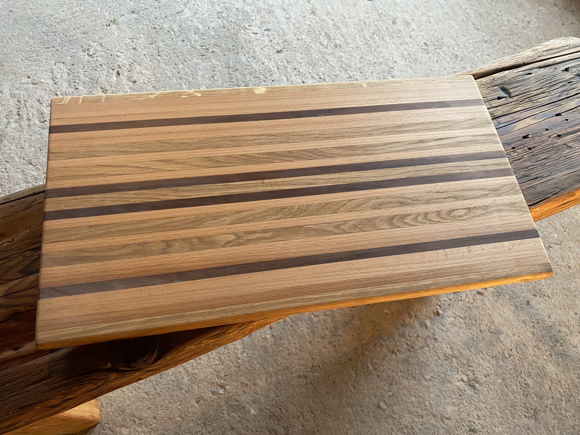 Großes Schneidebrett / Brotzeitbrett aus Massivolz, hier Eiche, Buche und Nussbaum.